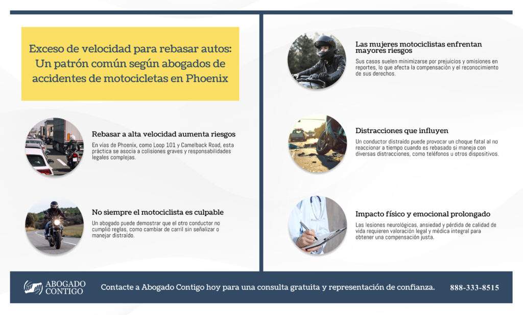Ante esto, los abogados de accidentes en Phoenix coinciden en que rebasar de forma acelerada no es en sí un delito, pero se convierte en un acto negligente cuando se hace sin considerar la visibilidad, la distancia con otros vehículos y las condiciones del tráfico. Muchos casos representados por Abogado Contigo tienen como elemento común esta combinación de velocidad excesiva y maniobras impulsivas, que terminan en colisiones donde el motociclista resulta gravemente herido.