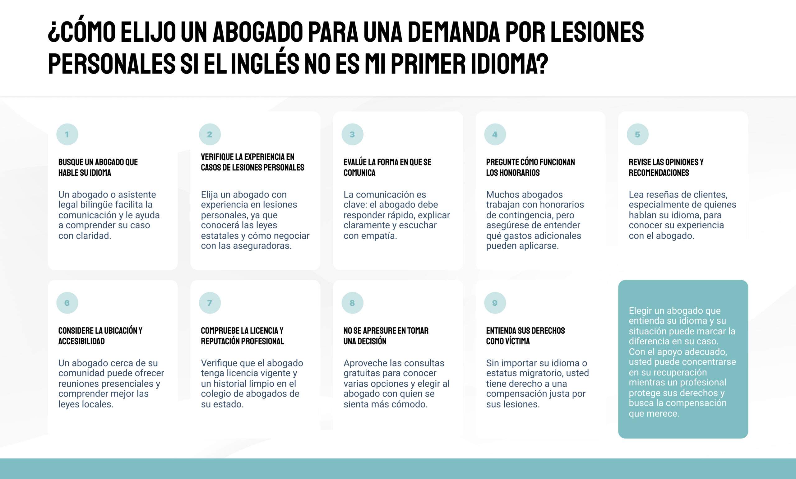 A continuación, se presentan consejos útiles para elegir un abogado que pueda representarlo eficazmente en su demanda por lesiones personales, incluso si su dominio del inglés es limitado.