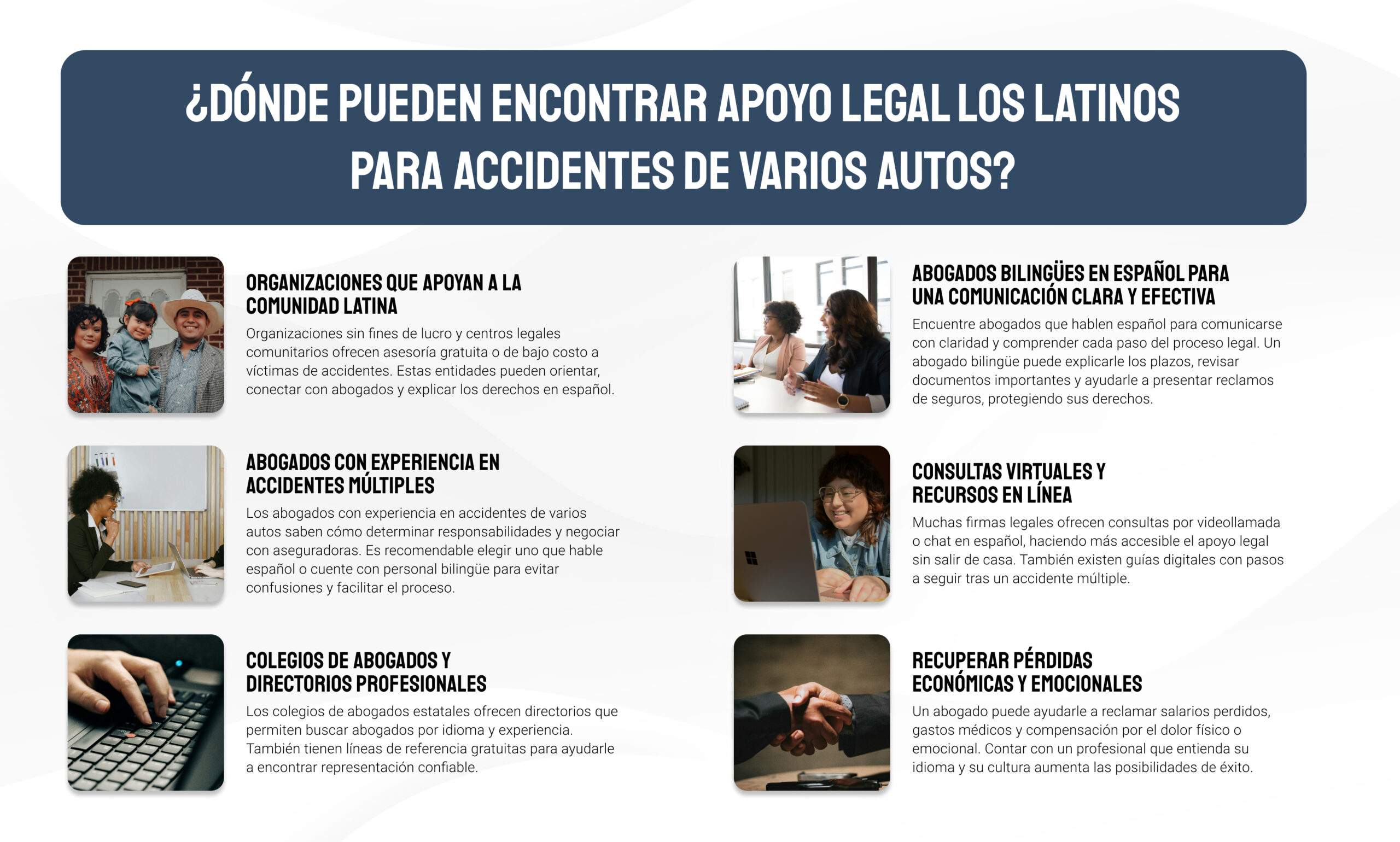 Existen organizaciones sin fines de lucro y asociaciones que se enfocan en brindar asistencia legal a la comunidad latina. Estas entidades pueden ofrecer orientación inicial, referir a abogados de confianza y explicar los derechos de las personas después de un accidente.