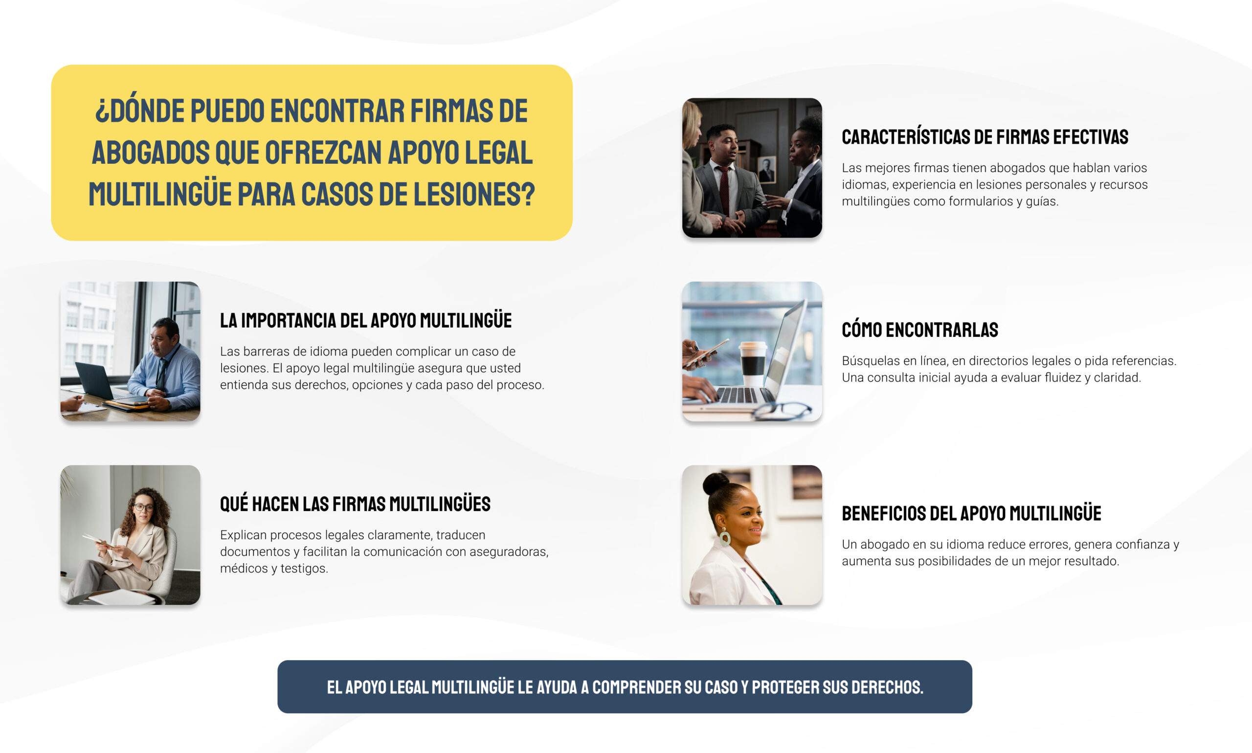 En casos de lesiones personales, localizar una firma de abogados que ofrezca apoyo legal multilingüe puede marcar una gran diferencia en la resolución de su caso. Para encontrar la asistencia adecuada, considere: